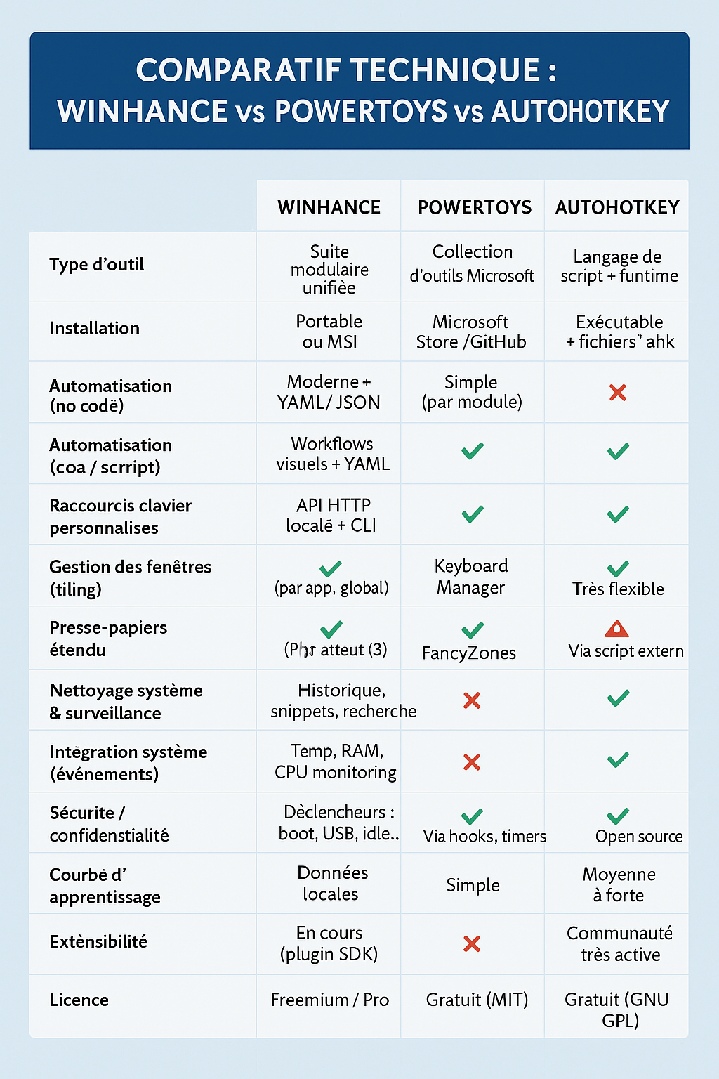 | Fonctionnalité / Critère | Winhance | PowerToys | AutoHotKey |